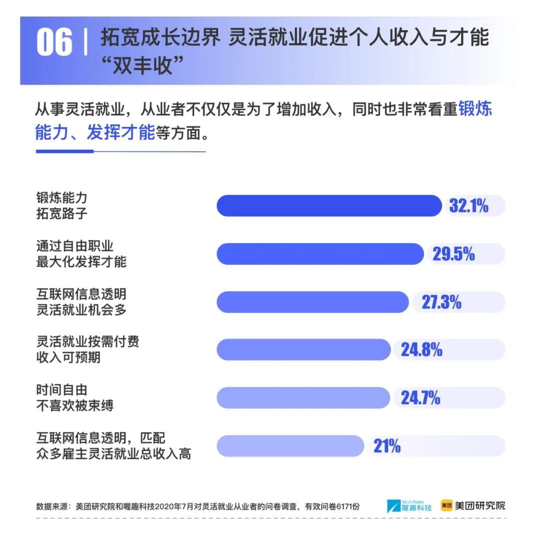 从事灵活就业,从业者不仅仅是为了增加收入,同时也非常看重锻炼能力、发挥才能等方面。32.1%的从业者是为了锻炼能力、拓宽路子;29.5%的从业者是通过自由职业最大化发挥才能。