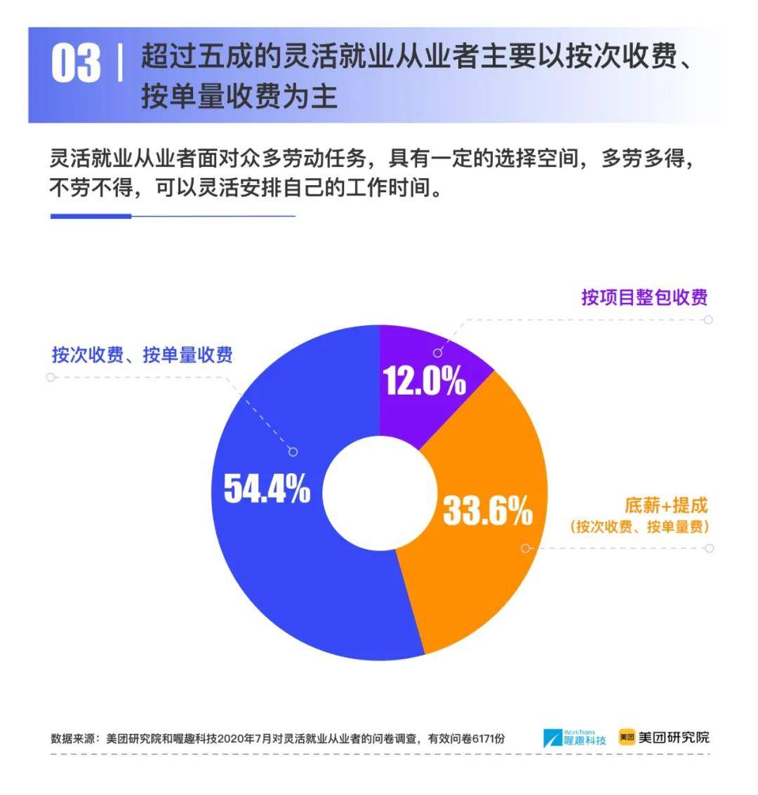 报告指出:按次收费、按单量收费是典型的基于任务的收费方式。灵活就业从业者面对众多劳动任务,具有一定的选择空间,多劳多得,不劳不得,可以灵活安排自己的工作时间。灵活是灵活就业的重要特性。