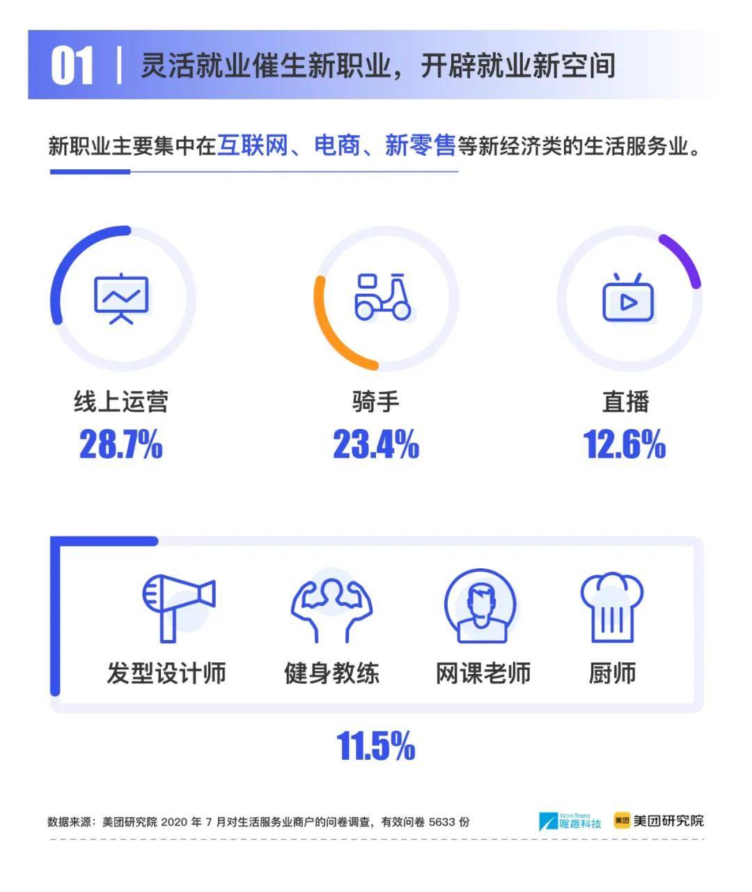 报告显示,灵活就业催生了不少新职业,包括线上运营、骑手、直播、网课老师、健身教练等。新职业行业主要集中在互联网、电商、新零售等新经济类的生活服务业。