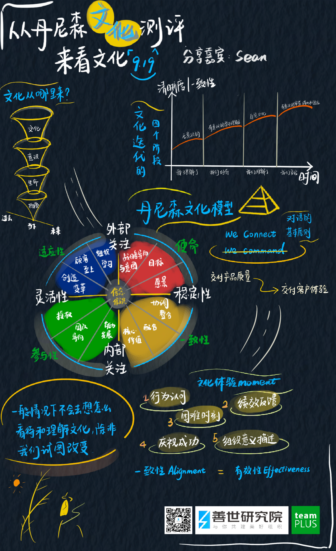 如果你有创业的打算,或者已经身在其中,不妨顺着这个思路想想,你组织目前的阶段:从使命的阶段开始,组织的建立从两三个人,七八条枪开始干起,从创始人身上开始透出文化,把视角向外,先想清楚企业的立身之本:使命和战略是什么?我们因何而存在?究竟是选人多拥挤的大道,还是人少崎岖的小路?到了一致性的阶段,团队规模渐长,突破200人以后,沟通过程变得繁琐,信息失真也开始影响着决策。需要有一些机制和规则让各部门协调变得顺畅,从而产生一个组织的行为习惯,传递要和不要载体——价值观。接下去是参与性的阶段,从稳定性过渡到灵活性的过程中,我们要基于组织的可持续发展建立能力体系和团队,引入更多的人才和授权的设计。最后就是适应性的阶段,由内部视角向外部视角的扭转,我们该思考:是否该基于市场环境和客户需求,重新审视和迭代我们的文化?需要进行文化改革吗?丹尼森文化测评的本意并非让我们了解文化是什么,更不是在那48道问题中,而是帮助我们看清整体中每个维度的最优样本的差距。通过识别差距,思考怎样让组织更高效,一致性践行得如何? 从而找到自己的改善项在哪里?文化是一直存在的,并且永远都会伴随着组织发展,我们需要的不是某个框架或者模板,套用其获得答案,而是要了解组织的阶段,看见我们的改进之处。文化的塑造,本身就是一种结果,管理者的四大核心角色之一便是文化塑造者,通过领导力展现出的身口意,再到团队认可、遵照和践行的魂。