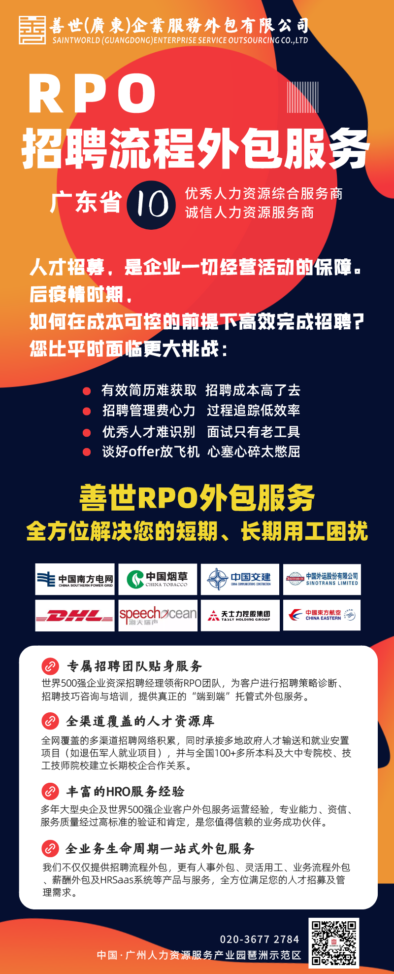 善世服务外包立足中国广州国家级人力资源服务产业园,秉持成为“企业人力资源经营伙伴”的服务理念,可为企业提供包括劳务派遣、人事外包、招聘外包、灵活用工、岗位外包、薪酬外包、HRsaas系统服务在内的一站式人力资源外包服务,力争帮企业合规降本,提升经营效率。
