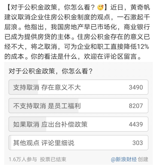 一石激起千层浪,各领域的专家和广大网友纷纷发表了自己的意见。在一项1.6万人参与的投票中,51.29%的网友选择“不支持取消”,不少人担心取消公积金将有损职工利益。有专家表示,简单说公积金取消,减轻企业负担,无非是加大老百姓的风险,绝对跟老百姓利益相悖。