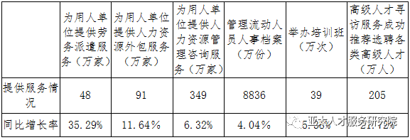 2019年,全国各类人力资源服务机构为48万家用人单位提供了劳务派遣服务,同比增长35.29%;派遣人员1174万人,同比增长8.90%;登记要求派遣人员812万人,同比增长12.85%。各类人力资源服务机构为91万家用人单位提供人力资源外包服务,同比增长11.64%。2019年,全国各类人力资源服务机构为349万家用人单位提供人力资源管理咨询服务,同比增长6.32%。管理流动人员人事档案8836万份,同比增长4.04%;依托档案提供档案查阅、开具相关证明等服务5014万人次,同比增长2.44%。举办培训班39万次,同比增长5.38%;培训人员1569万人,同比增长11.63%。高级人才寻访(猎头)服务成功推荐选聘各类高级人才205万人,同比增长21.72%。(见表3)