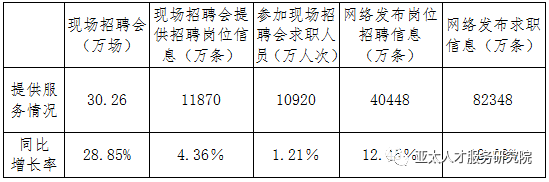 2019年,全国各类人力资源服务机构共举办现场招聘会30.26万场,同比上升28.85%(其中,高校毕业生专场招聘会6.84万场次,同比上升3.48%;农民工专场招聘会7.89万场次,同比上升12.03%);参会求职人员10920万人次,同比上升1.21%;参会单位687万家次,同比上升2.94%;提供招聘岗位信息11870万条,同比增长4.36%。2019年,全国各类人力资源服务机构通过网络发布岗位招聘信息40448万条,同比增长12.45%;发布求职信息82348万条,同比增长13.03%。(见表2)
