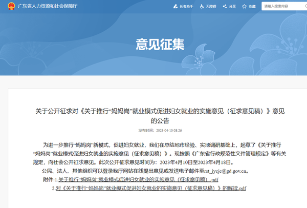 广东人力资源和社会保障局 | 关于公开征求对《关于推行“妈妈岗”就业模式促进妇女就业的实施意见(征求意见稿)》意见的公告