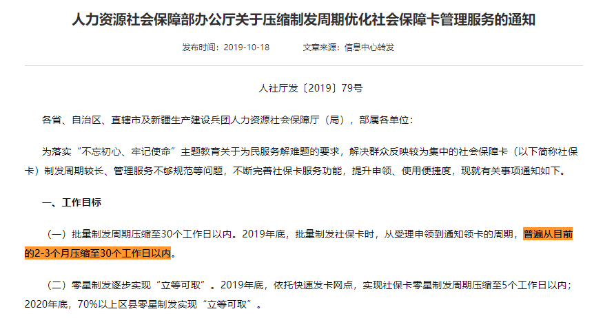 按照《人社部办公厅关于压缩制发周期优化社会保障卡管理服务的通知》要求:批量制发周期压缩至30个工作日以内,从受理申领到通知领卡周期,由原来的2至3个月压缩到30个工作日以内。