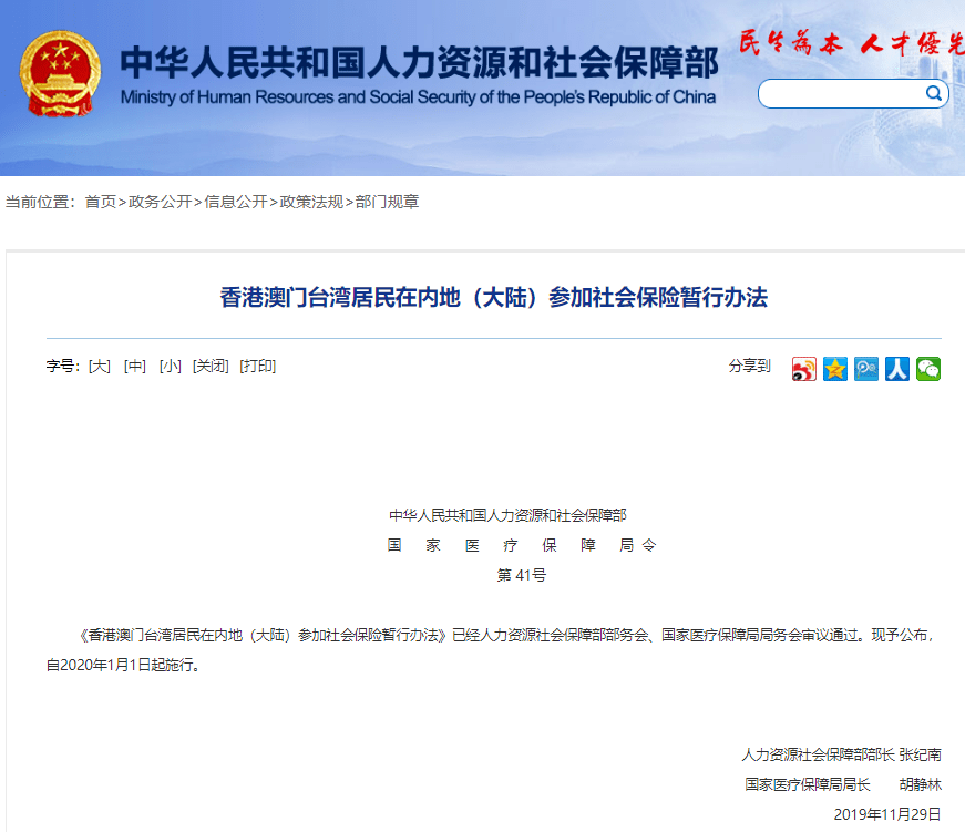 2020社保新规,1月1日起, 在内地工作、居住、读书的港澳台同胞,可以依法参加社保和享受社保待遇 !