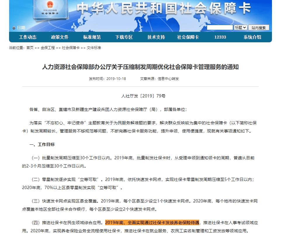 《人社部办公厅关于压缩制发周期优化社会保障卡管理服务的通知》要求:2019年底,全面实现通过社保卡发放养老保险待遇。对此前通过其他途径发放的,本着便民利民原则,2019年底逐步转为社保卡发放。