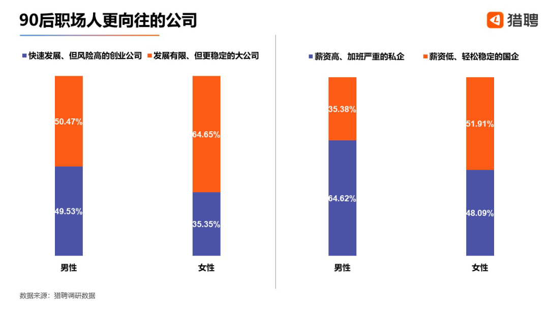同为90后,但在对待某些具体的问题上,不同性别之间存在明显的差别。例如,当面对选择“快速发展、但风险高的创业公司”还是“发展有限、但更稳定的大公司”时,男性选前者和后者的比例分别为49.53%、50.47%;而女性选这两者的比例分别是35.35%、64.65%。可以看出女性选择高风险公司的比例明显低于男性,而选择更稳定公司的比例则远远高出男性。